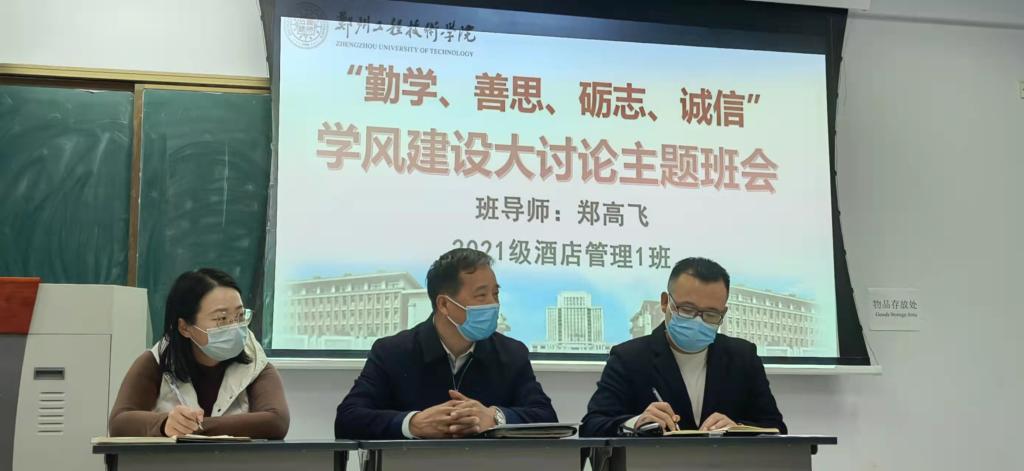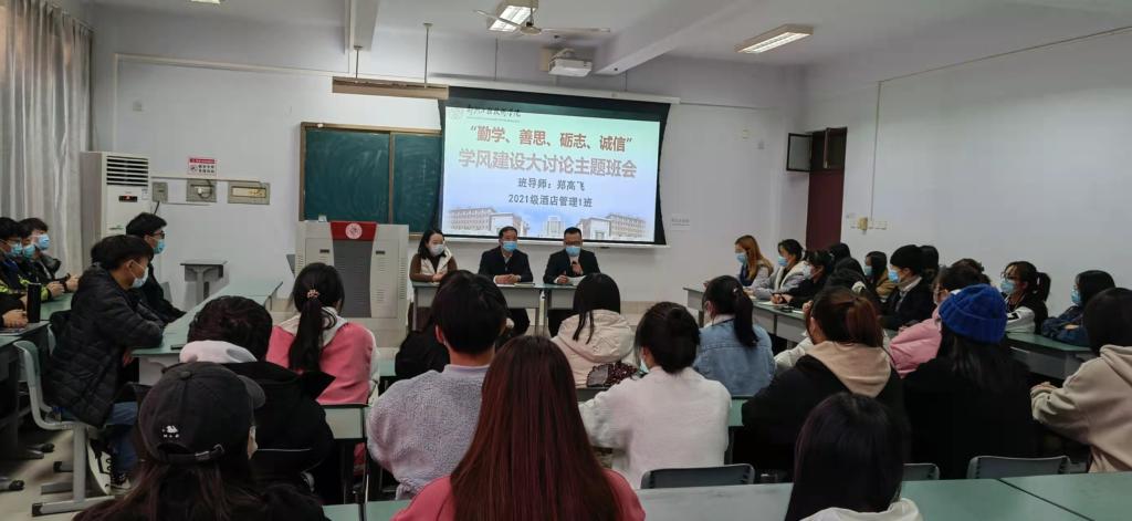 11月23日下午4点,在英才校区博识楼3203教室,郑高飞副董事长作为班导师,深入2021级酒店管理1班,召开题为“勤学、善思、励志、诚信”学风建设大讨论主题班会。此次班会由辅导员王剑主持,2021级酒店管理1班全体同学参加。