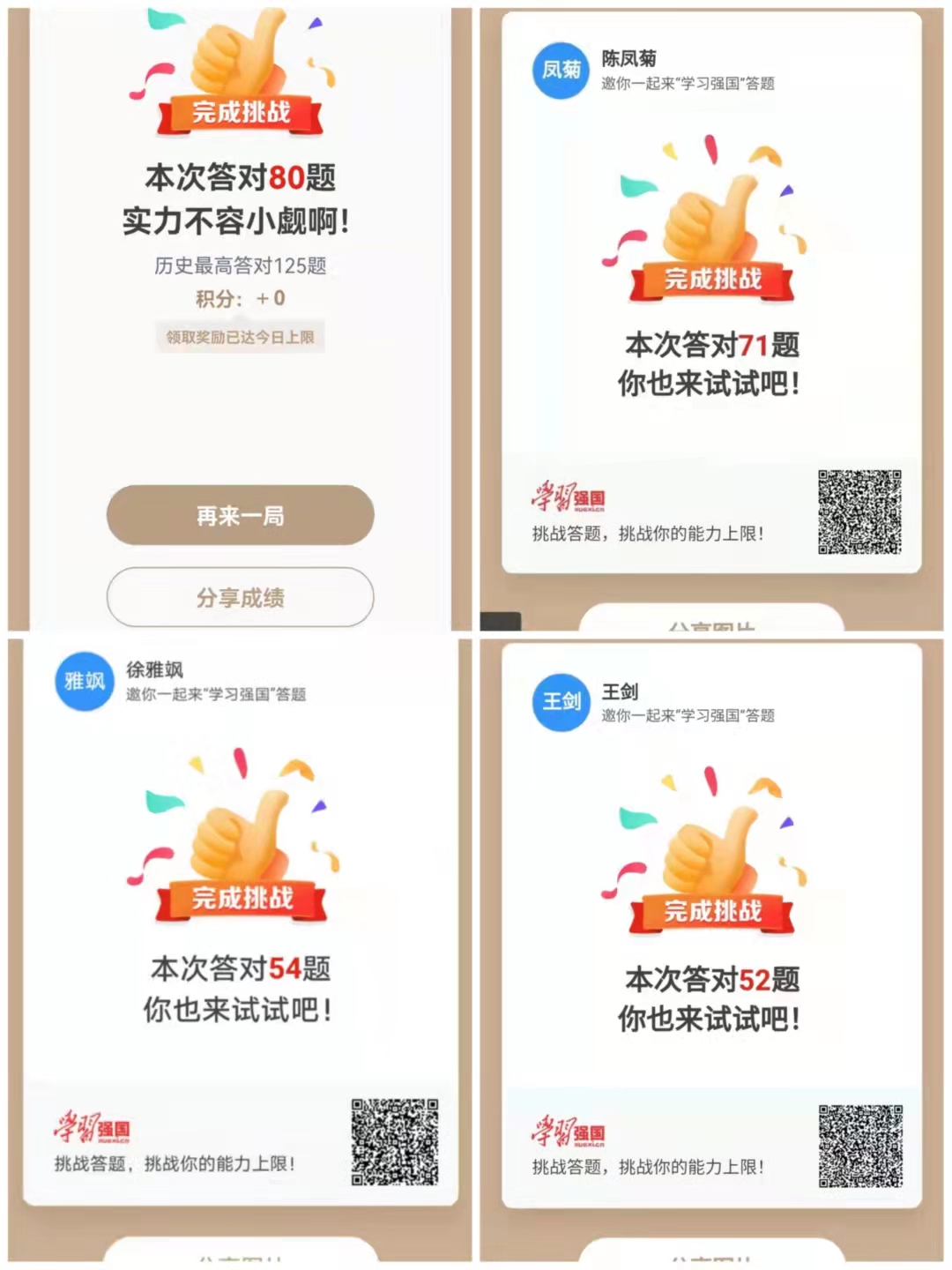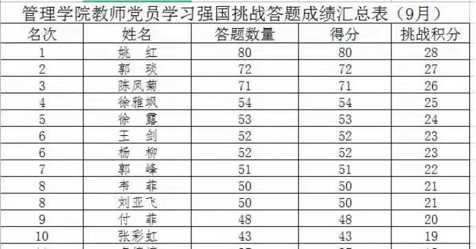 临近员工返校,各项工作同步推进的忙碌并未影响党员同志们参加答题挑战赛的积极性,本次比赛由党员们在规定比赛时间内自主进行线上答题,挑战次数不限,可任选其中一次成绩以截图的形式提交党支部,由党总支汇总成绩并进行排名。最后,积分前十名的老师获得本月“挑战达人”称号,旅游系党支部以积分第一名的成绩荣获“学习型党支部”的称号。