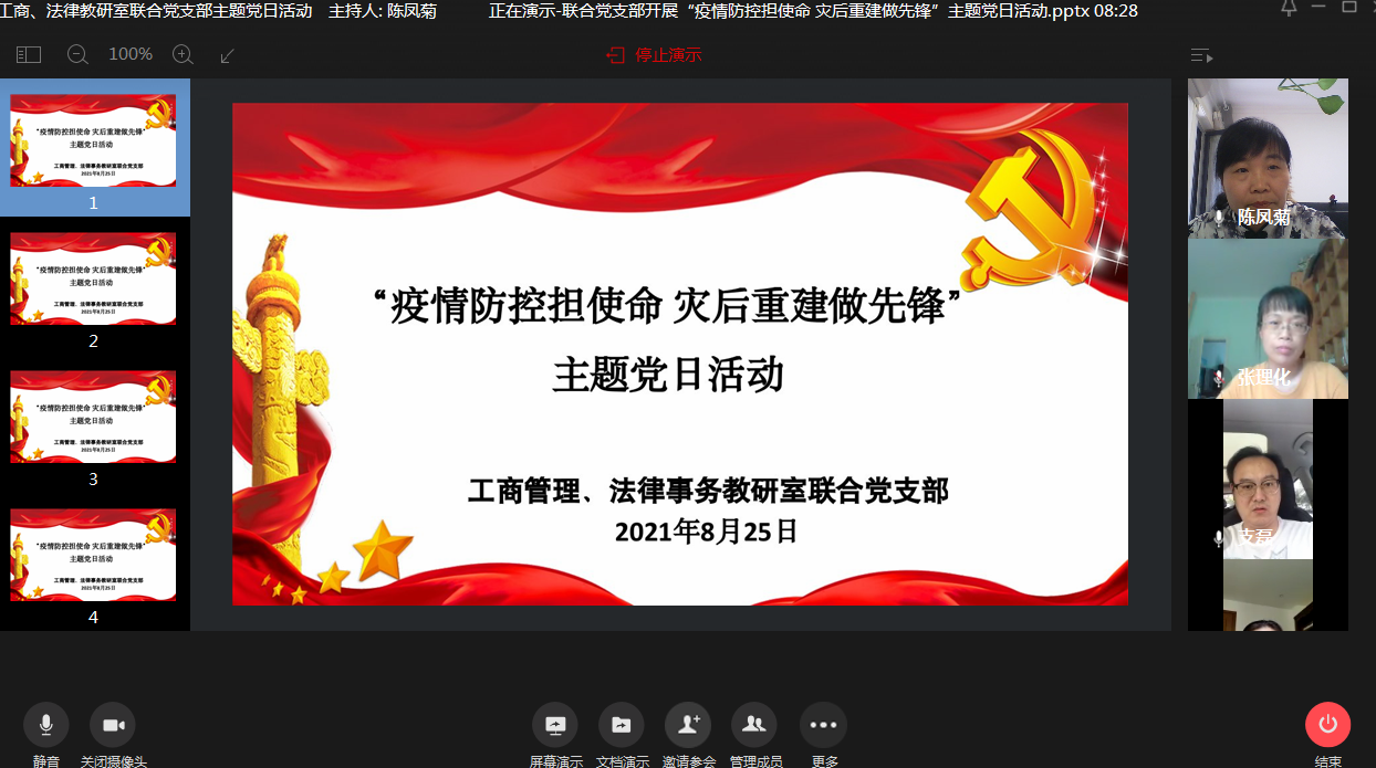 为认真学习贯彻习近平总书记重要指示批示精神,落实省、市及公司党委关于统筹开展疫情防控和灾后重建工作的安排部署,8月25日下午,球王会工商管理、法律事务教研室联合党支部利用企业微信平台在线上开展了“疫情防控担使命 灾后重建做先锋”主题党日活动。