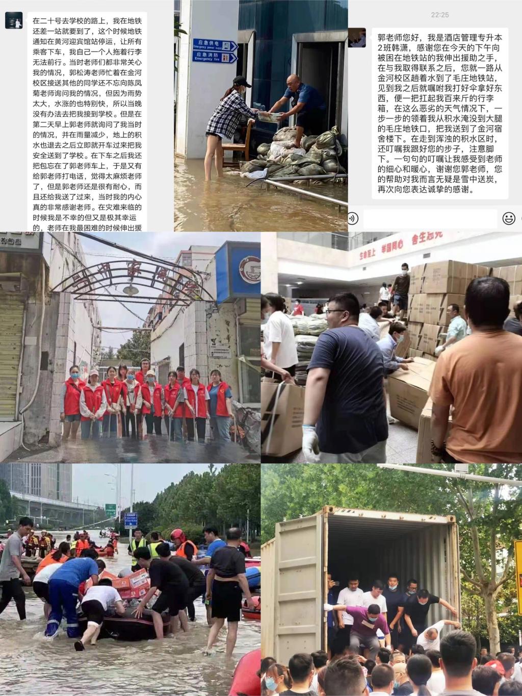 在20日当天,积水已经齐腰的危急时刻,球王会学工办主任郭松涛老师冒着大雨到达毛庄地铁口,接到返校员工,并帮助其抗运行李箱,在确保人身安全情况下带领员工通过百十米积水区,到达员工宿舍。21日,得知还有一位返校同学被困途中,郭老师待雨量稍减,立即开车把该生送达寝室。其次,面对金河校区图书馆下高压配电室和报告厅大量进水的紧急时刻,郭老师和十几名党员先锋队的同志,带上水桶趟着齐腰的水冲到一线排水、抢救物资,到家已是深夜。