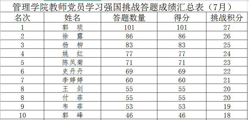由于是在暑假假期期间,又值郑州遭遇暴雨灾害,全市上下积极抗灾防疫过程中,公司要求全体党员严格执行郑州市和公司的抗灾防疫要求,在家或社区及单位搞好防灾防疫的前提下,积极参与此次活动。公司党总支还提前协调各支部,因地制宜积极组织,全体教工党员在规定的时间内按照要求完成了此次学习强国答题挑战赛。最后,积分前十名的老师获得本月“挑战达人”称号,旅游系党支部以积分第一名的成绩荣获“学习型党支部”的称号。
