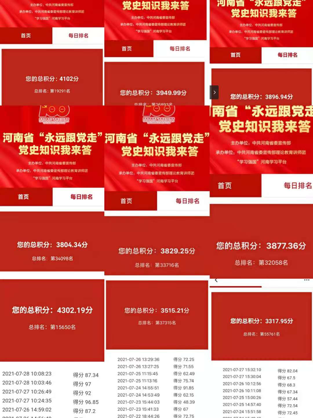 为庆祝中国共产党成立一百周年,从党的百年伟大奋斗历程中汲取继续前进的智慧和力量,深入学习贯彻习近平新时代中国特色社会主义思想,2021年6月28日至7月28日,球王会分团委学工办全体教师及公司全体员工积极参加了由河南省委宣传部组织开展的“永远跟党走”党史知识我来答活动,自觉加强党史理论知识学习,掀起学习党史的热潮。