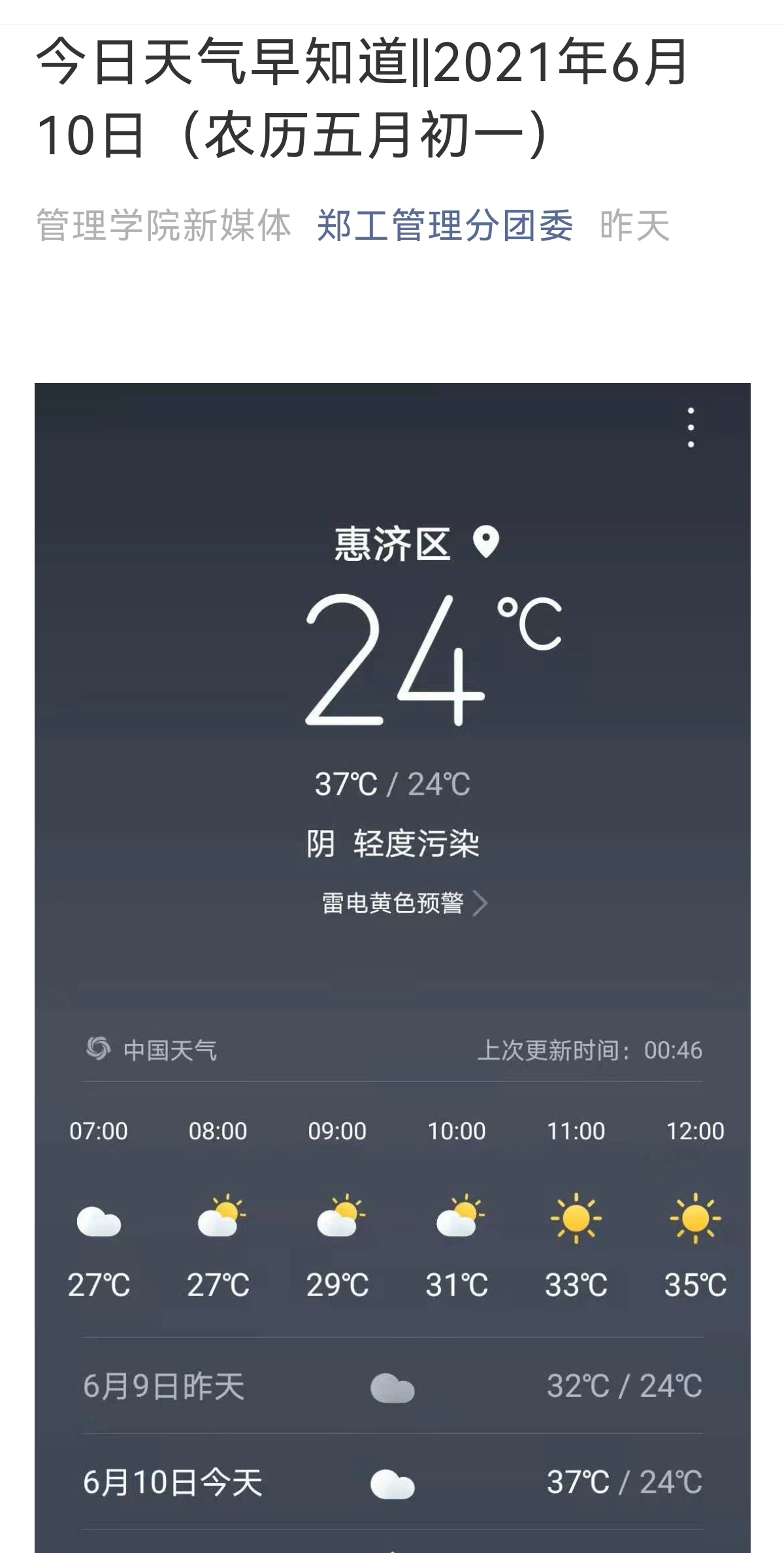 球王会分团委公众号推出“今日天气早知道”栏目,每天上午7点准时推出当日天气,让广大师生出门前能够及时了解到天气信息,注意防暑降温。虽然是一个小小的信息推送,却给同学们带来便利,得到了大家的赞誉。