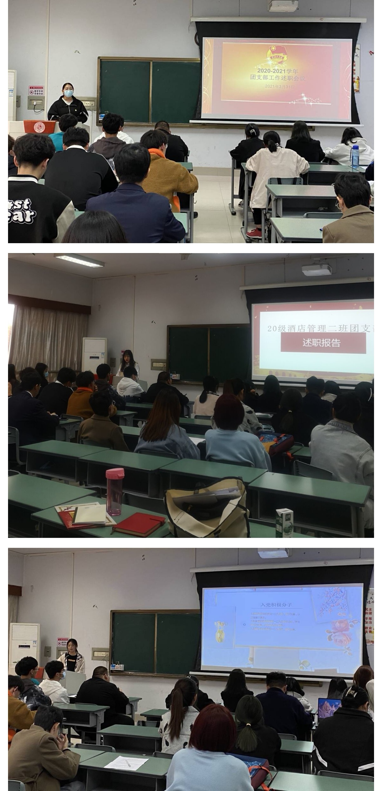 会上,各班级团支部结合图片与数据,清晰地陈述了一学年来各团支部的工作亮点、不足以及对未来工作的思考。一年来各团支部在疫情防控的严格要求下,依旧为同学们带来了精彩纷呈的线上、线下活动;在群团改革的背景下,分团委和各团支部仍需要进一步加强内部的沟通交流;未来,各团支部会积极配合公司、公司将继续砥砺前行,全心全意为同学们提供更好的服务。