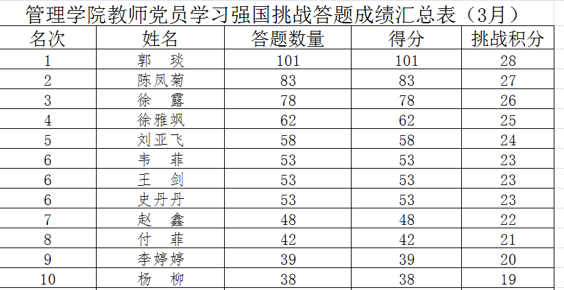 3月31日下午,为了充分利用“学习强国”平台资源,进一步调动广大党员教师的学习积极性,形成比学赶超的浓厚学习氛围,公司党总支继续举办每月“学习强国挑战答题赛”。在本月份挑战赛中,郭琰、陈凤菊、徐璐、徐雅飒等十名同志获得本月“学习强国挑战达人”称号,郭琰同志以总分第一的成绩获得冠军。旅游系党支部以积分第一的成绩再次荣获“学习型党支部”的称号。