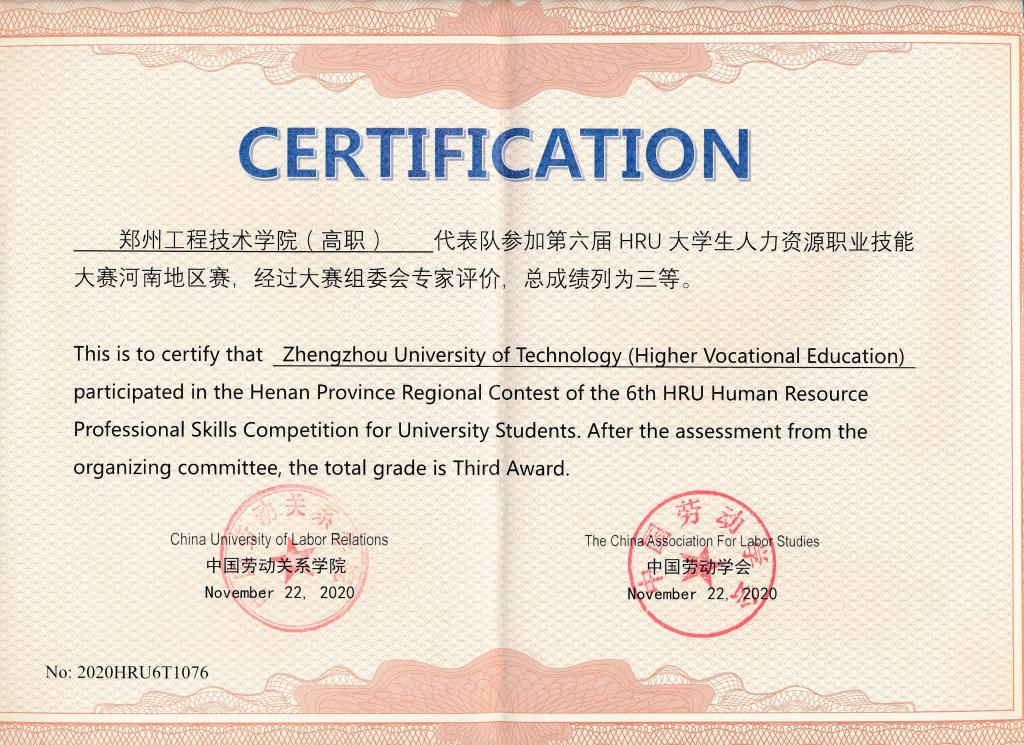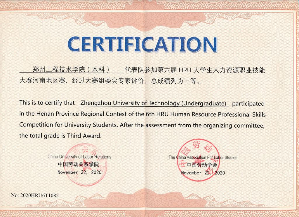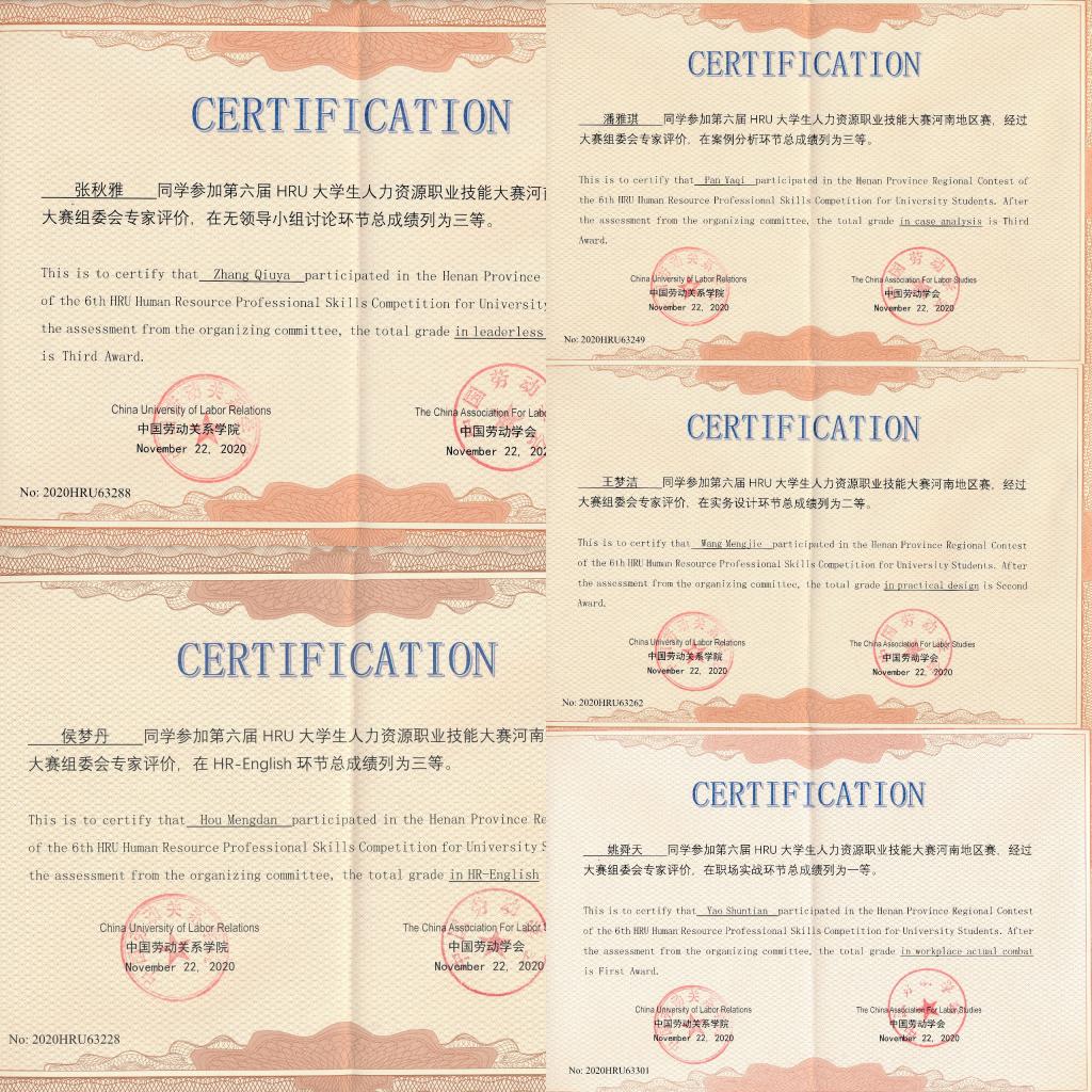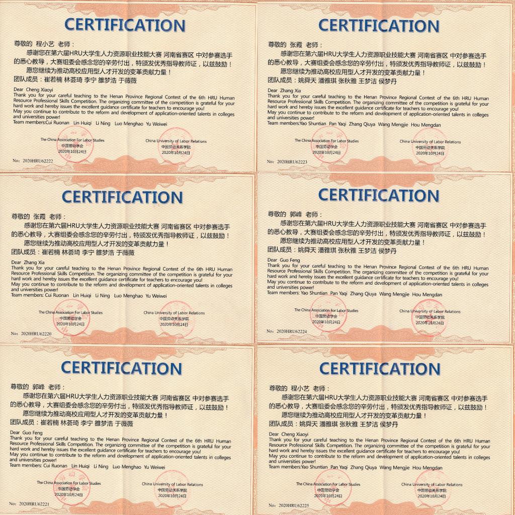 近日,由中国劳动学会、中国劳动关系公司主办的第六届HRU老员工人力资源职业技能大赛河南赛区比赛正式结束。比赛共有来自河南省内郑州大学、河南财经政法大学、河南理工大学等20多所高校110余名选手参赛。公司由张霞、郭峰和程小艺老师任指导教师,2018级人力资源管理专业崔若楠、林荟琦、雒梦浩等10名同学组成的2支代表队,最终获得本科组团体三等奖1项,专科组团体三等奖1项,员工组个人单项一等奖1项、二等奖1项、三等奖8项。张霞、郭峰、程小艺获优秀指导教师称号。