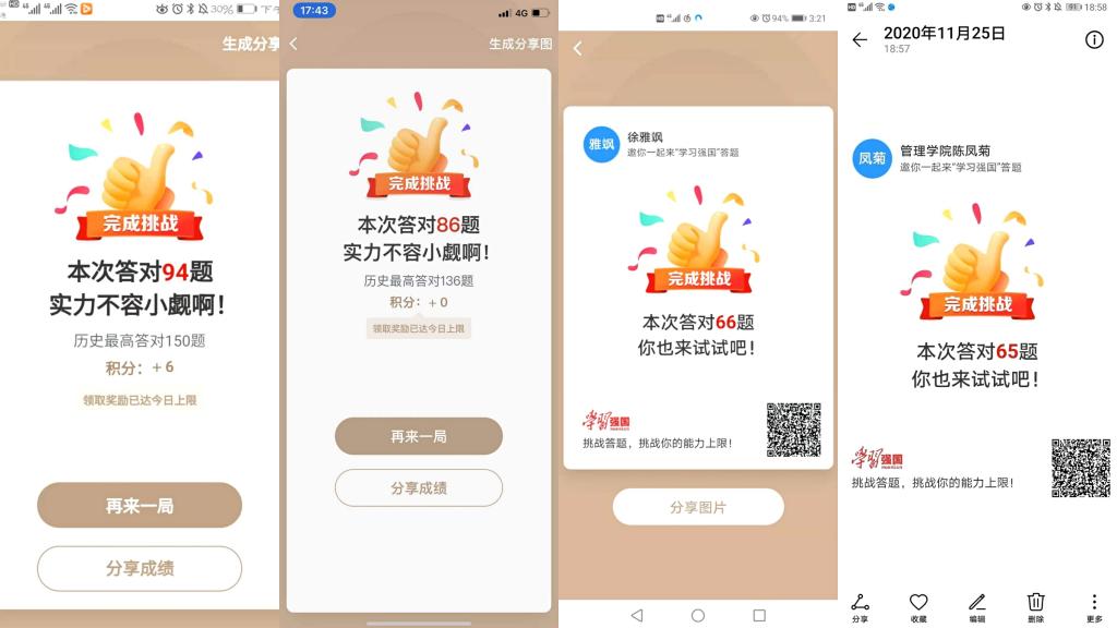 部分“学习强国挑战达人”成绩截图