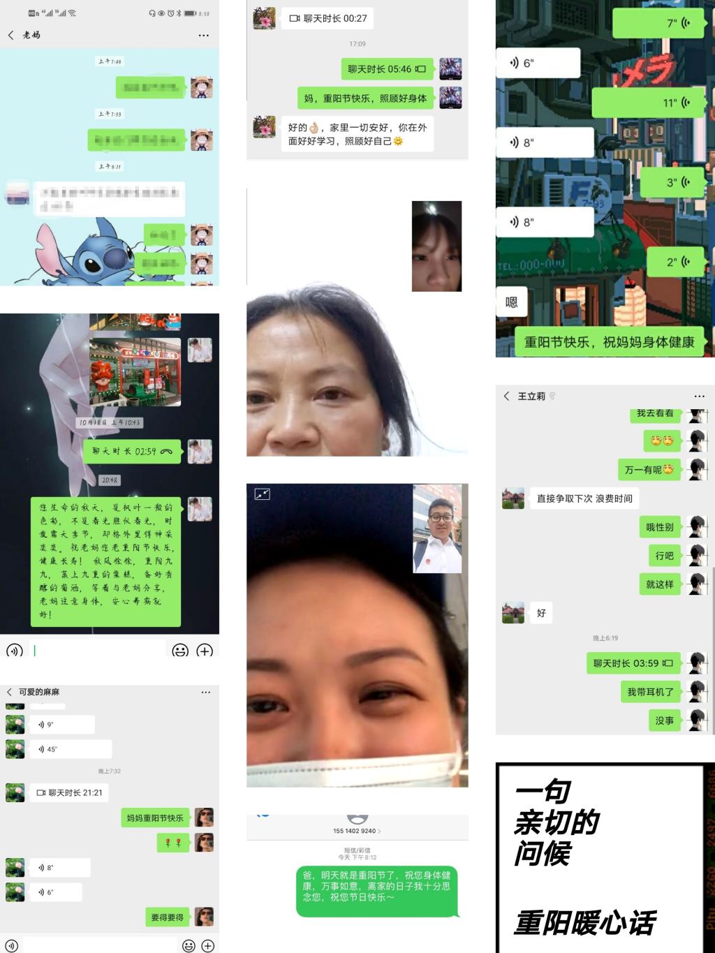 由于疫情的原因,2020年同学们和家人朝夕相处了已近9个月的时间,但是对于长辈和家庭的关爱依然是恋恋不舍呢,这次分团委开展“我们的节日·重阳”——暖心话活动,希望同学们通过给家人打过视频电话、发短信等这种最简单、最直接的方式表达对家人的爱和美好祝福。从图片中,我们能看到当家人收到我们的来电时脸上洋溢的笑容,能看到短信中亲情流露的温暖。这次活动的形式虽然简单,却让长辈感受到了自己的一份爱。