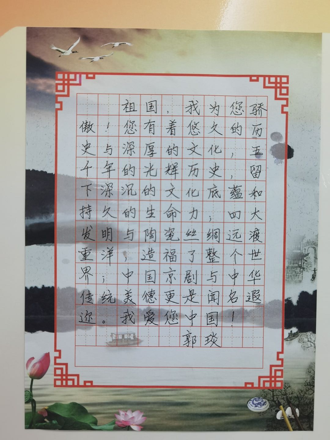 9月30日,在新中国成立71周年到来之际,公司举行“祖国,我想对您说”主题活动,在郭琰经理的带领下,全院教师采用书写的形式对祖国寄语,表达对祖国浓浓的爱,深深的情!