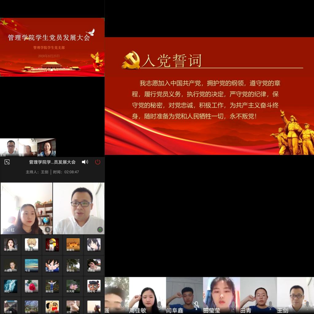 会议第一项,由发展对象逐一进行入党志愿书的宣读以及介绍自己的入党动机。申请入党的同学们都真情的表达了对党的向往,对党的忠诚,表示坚定不移跟党走,为党的工作付出自己的力量,为共产主义事业奋斗终生。表明了入党动机和他们要加入中国共产党的强烈愿望。第二项,每位发展对象的入党介绍人也对其进行了关于学习、工作、实践活动等方面的综合评价。第三项,与会的党员同志对23名发展对象,自培养期以来的表现进行讨论。第四项,与会有表决权的正式党员对接收预备党员进行无记名投票表决,最终全体与会正式党员一致同意陈宁等23名发展对象正式成为预备党员。会议第五项,由员工党支部组织委员田青老师带领新发展预备党员进行入党宣誓,他们高亢激昂的声音通过网络视频久久回荡,真正展现出了对党的崇高敬意。