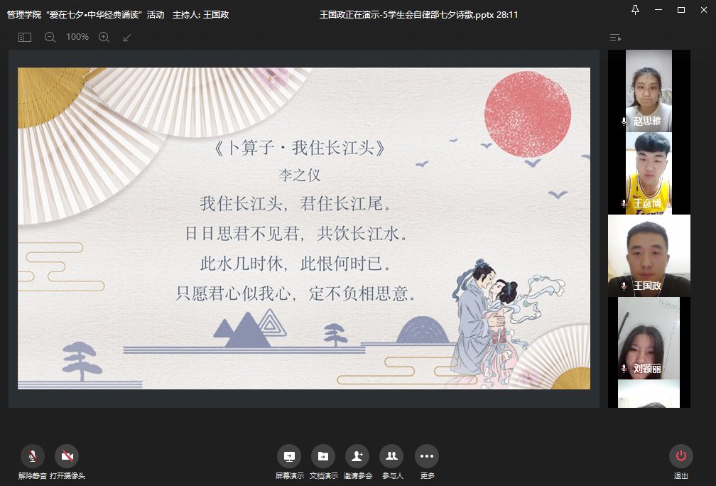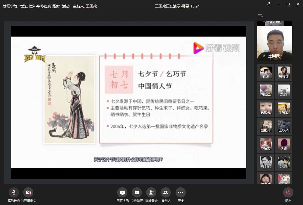 8月25日是中国传统节日“七夕”节,为培育和践行社会主义核心价值观,弘扬中华优秀传统文化,引导同学们认知传统、尊重传统、继承传统、弘扬传统,促进现代家庭观念的健康成长,鼓励广大青年员工拥有奋发向上的精神力量和团结和睦的精神纽带,8月23日19:00,球王会分团委、员工会举办“爱在七夕,中华经典诵读”线上主题活动。