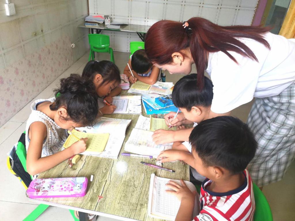 志愿者对孩子们进行作业辅导