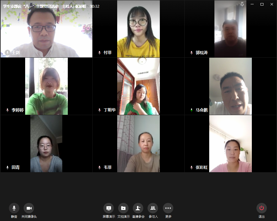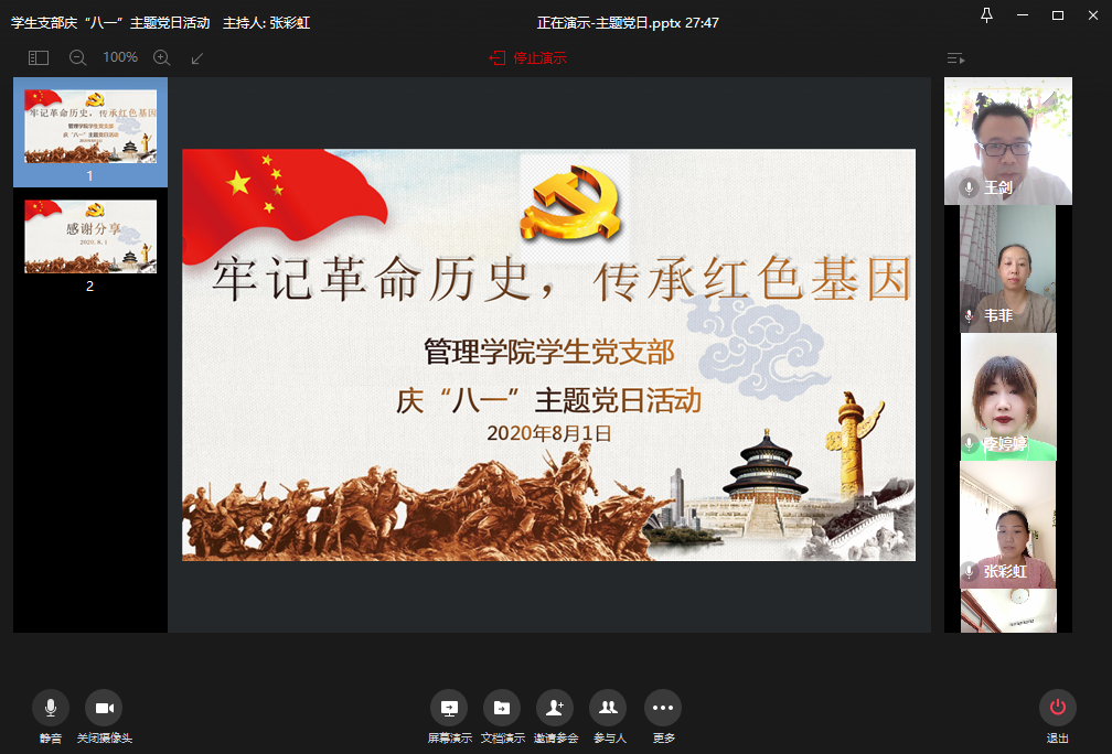 为热烈庆祝中国人民解放军建军93周年,引导广大党员深入学习习近平总书记参观四平战役纪念馆重要讲话精神,回顾党领导的人民军队用鲜血铸就革命成功的光辉岁月,根据公司党总支关于开展主题党日活动的要求和活动方案,员工支部组织全体教工党员于8月1日下午在企业微信会议平台开展了“牢记革命历史,传承红色基因”主题党日活动。本次活动由员工支部副书记王剑主持。