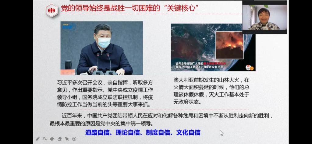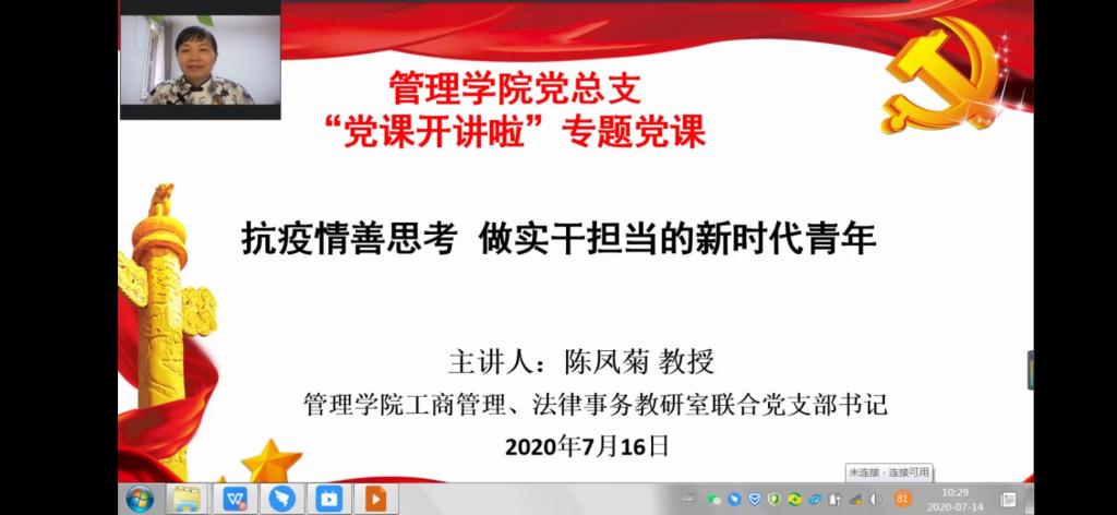 陈凤菊教授以《抗疫情善思考做实干担当的新时代青年》为题目,从三个层面进行了分析和阐述:一、从中国上下一盘棋取得抗疫情的阶段性胜利,阐明了党的领导始终是战胜一切困难的“关键核心”;二、以优秀共产党员钟南山院士、张定宇经理、董宗祈等教授为代表的党员干部的感人事迹的分享,阐明了冲锋在前的共产党员始终是人民群众的主心骨;三、通过这次疫情防控大考,鼓励支部党员和公司入党积极分子学会理性思考,号召支部党员把战疫精神化为教育力量,改变教与学,推动“课堂革命”,用网络技术赋能教师发展。