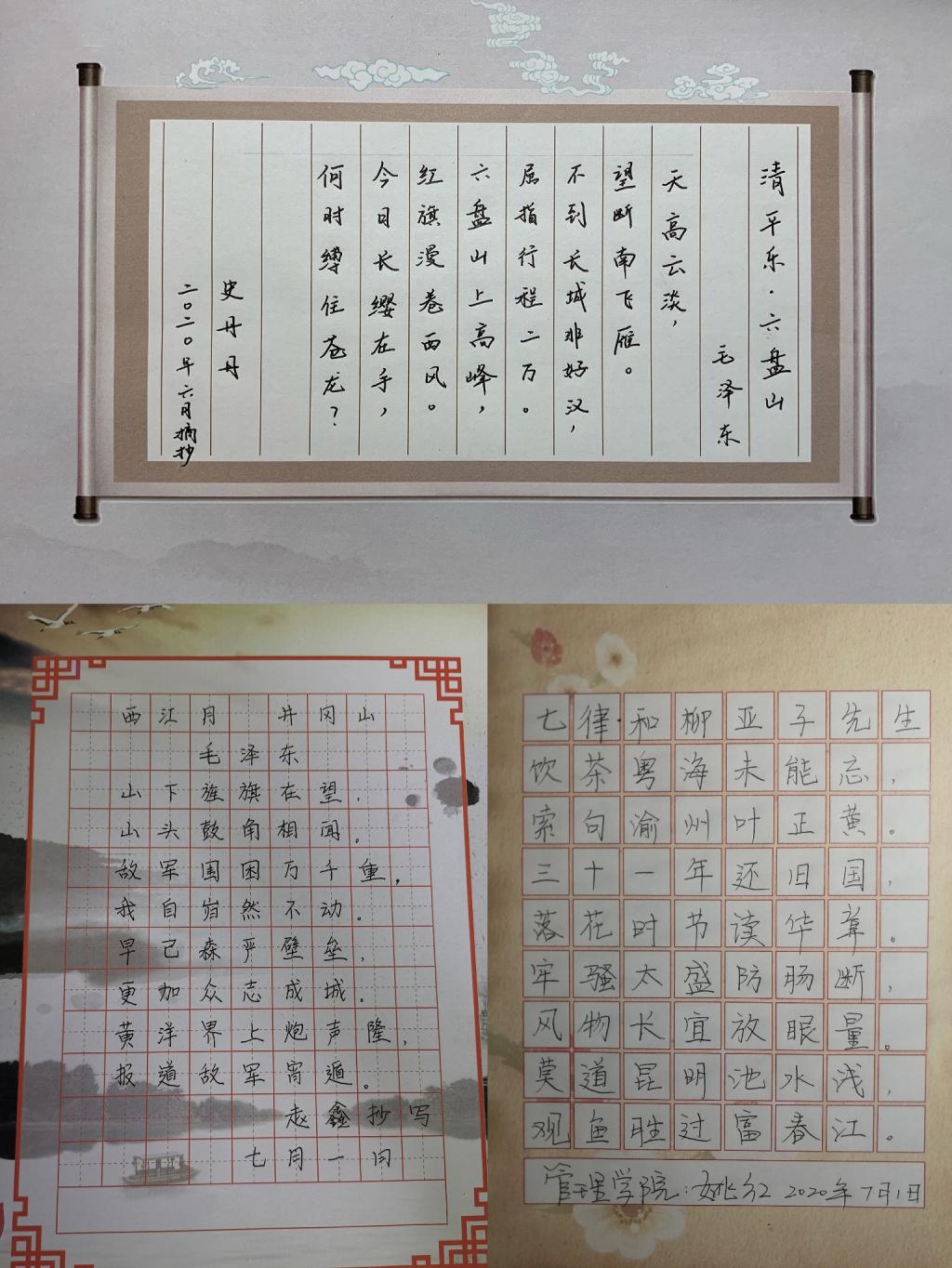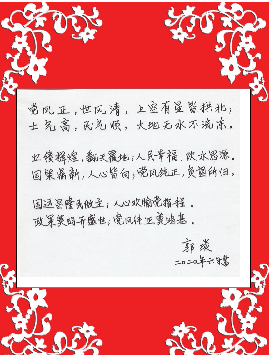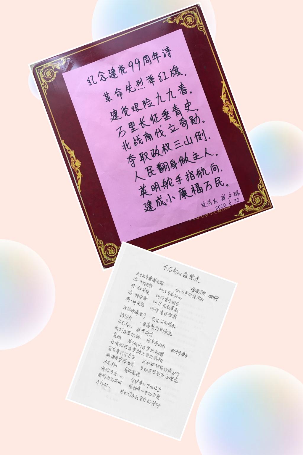 党员教师的书法作品均以红色经典诗词、习近平总书记经典用语等为主要内容,再现了党领导中国人民所走过的峥嵘岁月,抒发了对党和人民真挚的感情和深深的爱。其中郭琰经理的作品笔势俊美,气韵生动,作品内容充分展现了在党的领导下国富民强,百姓安居乐业的生动画面;张文瑞老师改编的纪念建党99周年诗,回顾了党的奋斗历程;杨柳老师的不忘初心跟党走,抒发了新一代年轻党员对党的深深的爱;刘亚飞老师重温入党誓词,让我们再次回望和肯定了我们的初心。其他老师的作品以毛主席诗词为题材,包括大家所熟知的《七律·长征》、《清平乐·六盘山》《西江月·井冈山》《七律·和柳亚子先生》等。老师们的作品或遒劲大气,或飘逸潇洒,或玲珑娟秀,充分展现了教师们扎实的书写功底和良好的教学素养。