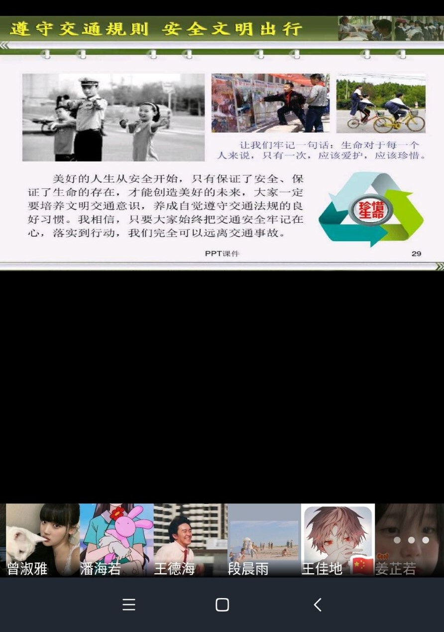 主题团日以各团支部为单位,通过线上网络会议的形式开展。会议伊始,各班团支书首先介绍团课主题,绕后通过“血的教训”、“事故原因”和“法规学习”三个方面的PPT课件内容,结合身边事例深刻阐述文明交通的重要性。