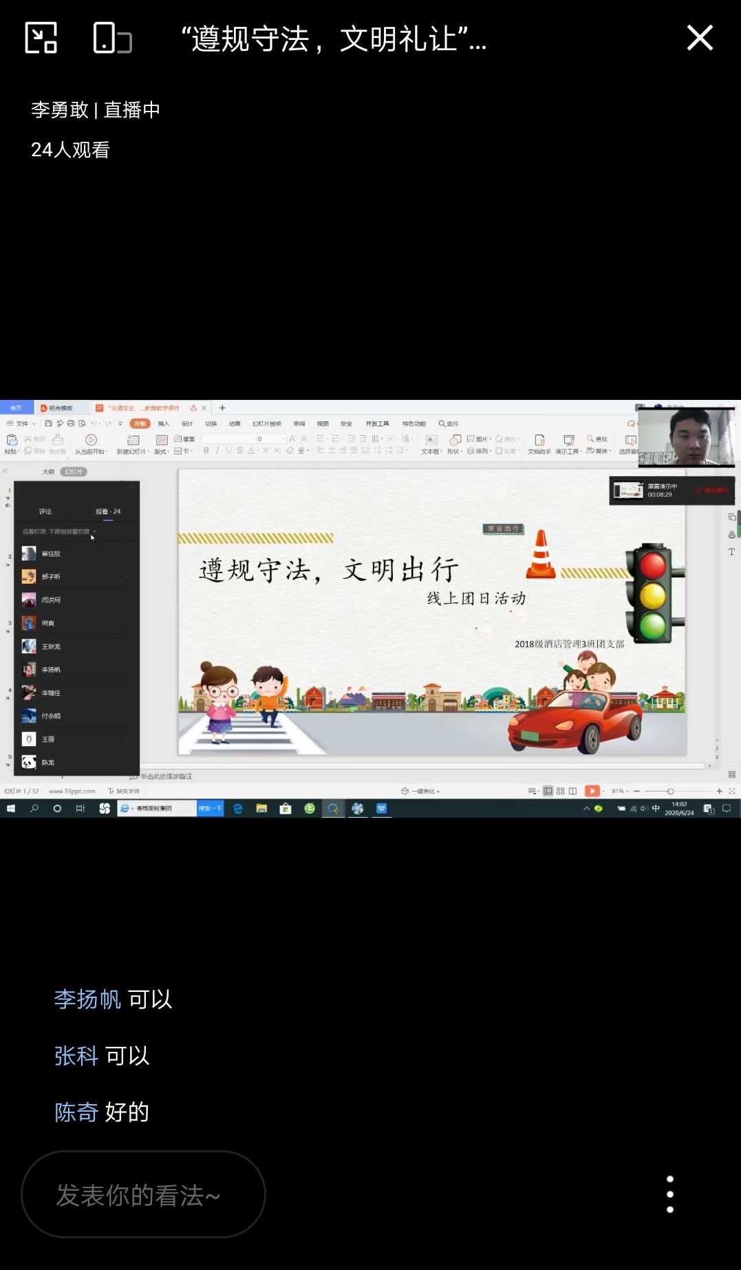 在各团支部的交流发言环节,2018级酒店管理3班的陈龙对于此次的活动阐述了自己的看法:文明是一种习惯,我们应把文明融入我们的生活之中成为我们生活的一部分,为城市建设奉献我们的力量;2019级旅游管理3班孟涵同学也有自己的见解,文明出行不仅仅关乎自己的文明,更关乎社会安全,每个人的生命安全。其他各班同学也连麦发言,讲述身边不文明的交通习惯以及危害,倡导大家认真学识交通法规,倡导文明交通,摒弃交通陋习,争做文明的宣传者和践行者。