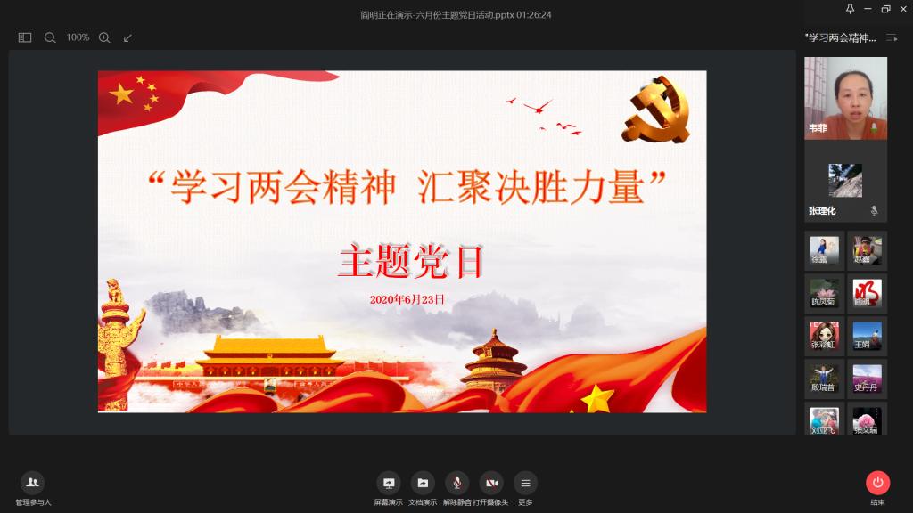5月28日,十三届全国人大三次会议、全国政协十三届三次会议圆满完成各项议程,胜利闭幕。这是我国在新冠肺炎防控阻击战取得重大战略成果、全面建成小康社会进入决战决胜阶段的重要时刻召开的极为特殊而又意义重大的会议。会议讨论批准了政府工作报告和全国人大常委会工作报告、通过了《中华人民共和国民法典》和全国人民代表大会关于建立健全香港特别行政区维护国家安全的法律制度和执行机制的决定。为深入学习两会精神,明确2020年经济社会发展的总体部署,理解编撰实施《中华人民共和国民法典》的深远意义,了解香港国安立法的时代背景,汇聚决战决胜的磅礴力量,公司党总支于6月23日下午14:30-16:30线上开展“学习两会精神 汇聚决胜力量”主题党日活动,公司党总支副书记韦菲、球王会副经理郭凯出席活动,党总支全体党员在线参加,活动由球王会教工党支部书记徐露主持。
