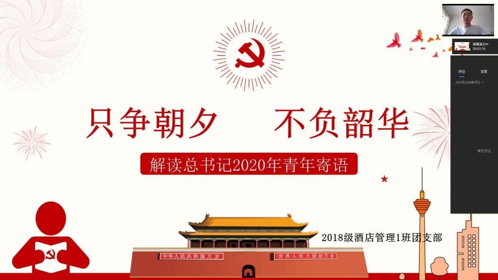 下午,一场别开生面的线上学习习近平总书记寄语交流会陆续展开。会议以各班团支书为主导,通过企业微信、钉钉等线上形式举办。首先,团支书以青少年的责任与担当引出活动主题,将围绕学习宣传贯彻习近平总书记五四寄语精神展开会议。班级的优秀员工代表主动参与到活动中来,积极分享自己学习到的习近平总书记寄语:“青春由磨砺而出彩,人生因奋斗而升华”“用青春去践行五四精神,展现伟大的爱国情怀”“新时代中国青年要勇于砥砺奋斗。面对艰难险阻,青年要奋勇向前”……接着,同学们纷纷举手要求发言进行交流讨论,表示会牢记习近平总书记期望和要求,并运用到实际学习生活中。2018级酒店管理1班乔永晓同学对自己提出要求:我们要不断增强自身实力,青年人不仅要志存高远,也要脚踏实地增长才干;2018级酒店管理1班牛婉璐同学从习总书记寄语中深刻感受到青年与国家的联系:少年强则国强,疫情面前我们责无旁贷,义不容辞;2019级旅游管理3班孟涵同学从中更加坚定了理想信念:青年要有更加强烈的家国情怀、更加忠诚的政治品格、更加远大的理想抱负……活动最后,各团支部总结员工发言,希望同学们通过此次会议都能正确选择自己的人生方向,牢记青年担当。