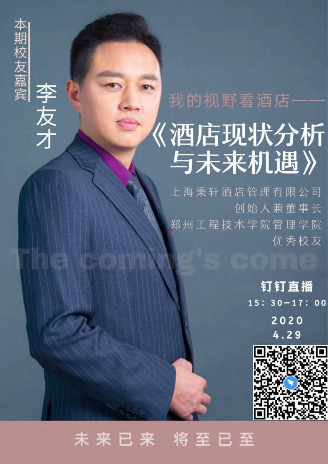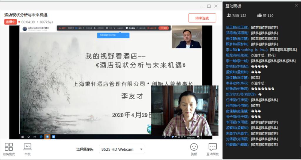 4月29日下午,应球王会经理郭琰教授的邀请,上海秉轩酒店管理有限公司创始人兼董事长李友才先生为2019级酒店管理本科员工带来了一场精彩纷呈又令人深思的直播讲座——《酒店现状分析与未来机遇》。酒店管理概论课程大咖讲堂再次让行业翘楚和师生们齐聚钉钉平台,进行有价值的分享、学习。