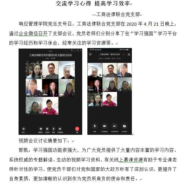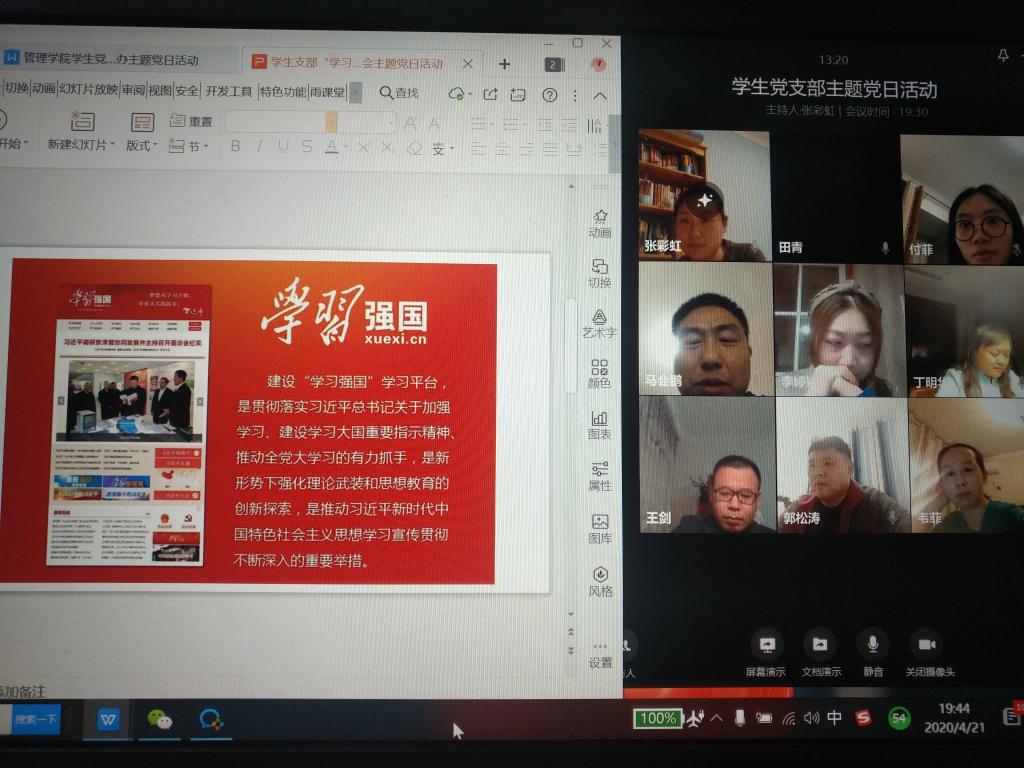 为加强学习交流,引导党员同志用好“学习强国”学习平台,进一步提升学习效果,公司党总支组织教师党员于2020年4月21日开展“讲述学习故事分享学习心得”网络主题党日活动。本次主题党日活动的主要内容包括:教工党员分享使用“学习强国”学习平台的学习经历和学习体会;推荐好的学习资源;就目前“学习强国”学习平台使用过程中存在的问题及解决的对策进行交流讨论。