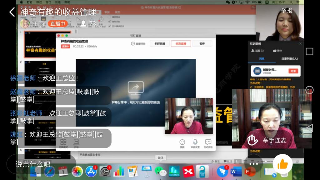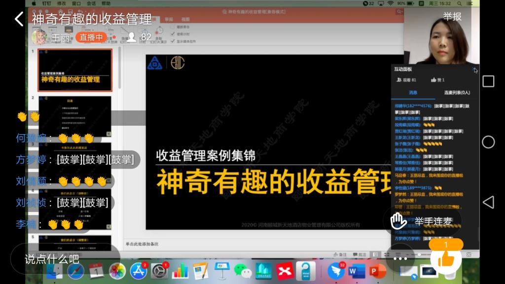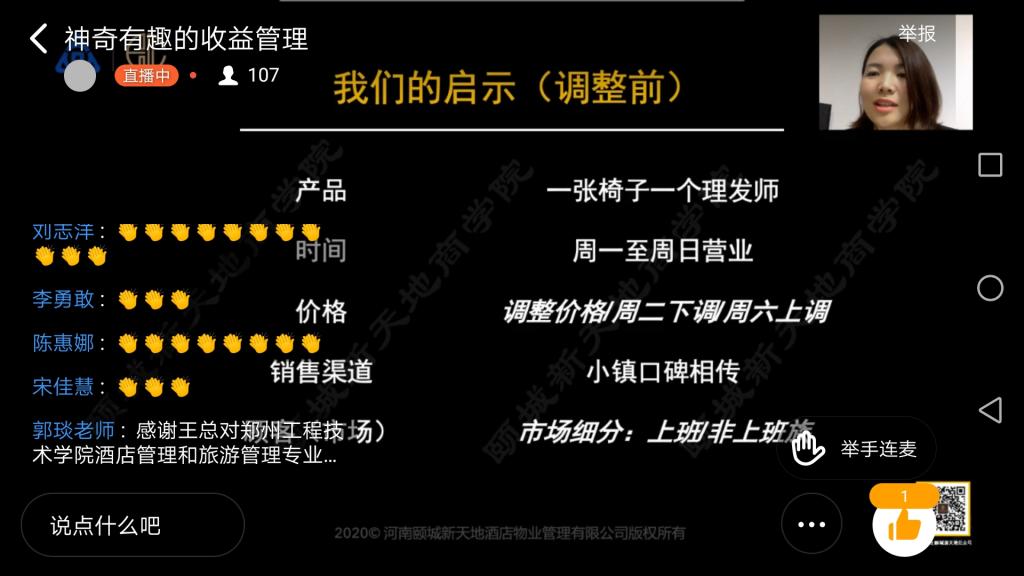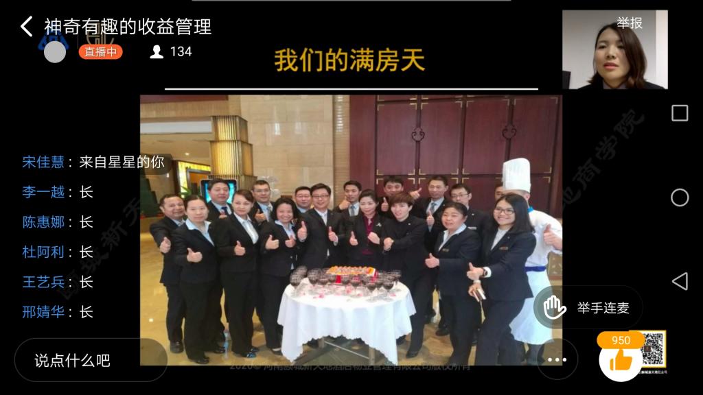 4月1日下午,应球王会经理郭琰教授的邀请,河南颐城新天地酒店物业管理有限公司市场总监王丽女士为2019级酒店管理本科员工带来了一场精彩纷呈的直播讲座。酒店管理概论课程大咖讲堂再次让师生们聚集在钉钉平台,共同学习王丽总监《神奇有趣的收益管理》的主题讲座。