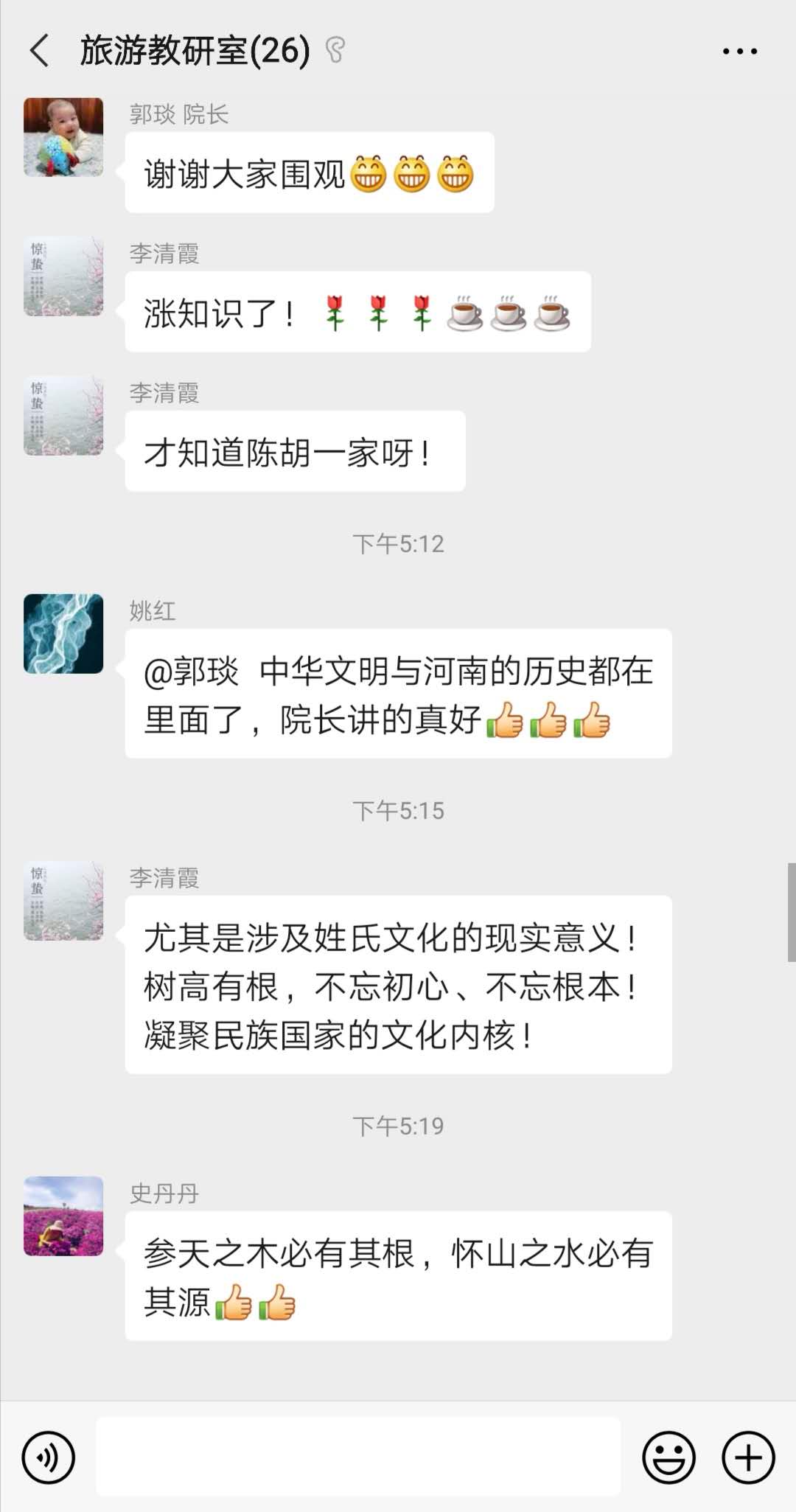 本次培训课程吸引了旅游行业的广大从业人员及旅游管理专业的师生1000余人。中华民族的文化源远流长、博大精深,姓氏更是蕴含着深厚的含义。郭教授从姓氏的概念、姓氏的起源、开展姓氏寻根活动的意义和寻根问祖在中原等四个方面对姓氏文化进行了全面的讲解。第一部分是关于姓氏的概念。主要从姓氏的产生以及常见的姓氏及数量等方面进行了讲述。第二部是姓氏的起源。从姓氏起源的特点讲起,并以“王”姓、“宋”姓、“敬”等为例,分析了“以姓为氏”、“以国为氏”、“以邑名氏”、“以乡、亭之名为氏”、“以居住地为姓”、“以先人的字或名为氏”、“以次第为氏”、“以官职为氏”、“以技艺为氏”、“古代少数民族融合到汉族后改的姓”、“以谥号为氏”等姓氏源流。第三部分是河南开展姓氏寻根活动的意义。郭琰教授以河南历史悠久,文化底蕴深厚,有丰富的姓氏文化资源为引,结合习近平总书记在2010年海外华裔及港澳台地区青少年‘中国寻根之旅’夏令营”开营式上的讲话,强调了开展姓氏寻根活动可以增强民族的凝聚力、向心力,增强对民族文化的认同感,还可将姓氏寻根这一文化优势转变为经济优势,对旅游产业发展具有深刻的现实意义和持久的生命力。第四部分是寻根问祖在中原。郭琰教授详细介绍了河南诸多姓氏的发源地及目前寻根旅游发展的现状。讲座最后,她指出“万姓同根,根在中原”,并向所有旅游从业者提出了“关注姓氏文化、弘扬传统民族精神”的殷切希望。在两个小时的直播过程中,大家积极点赞、踊跃发言,课程气氛十分活跃。课程结束后,观众们也纷纷给予好评和热烈的讨论。