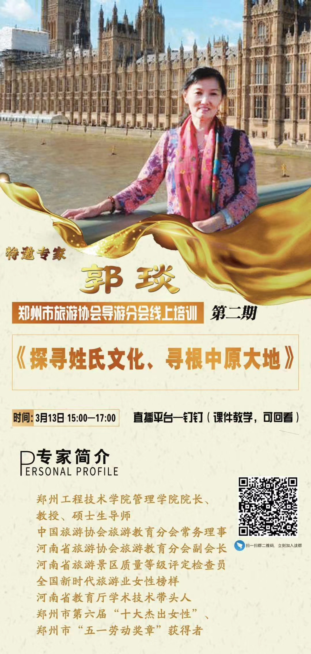 球王会经理郭琰教授应郑州市旅游协会导游分会的邀请,为提高导游队伍的整体素质,为旅游业恢复发展蓄力储能,着眼旅游行业从业需求,经过充分准备,于3月13日下午15:00-17:00在钉钉直播平台为大家带来了一场别开生面的线上培训公益课。