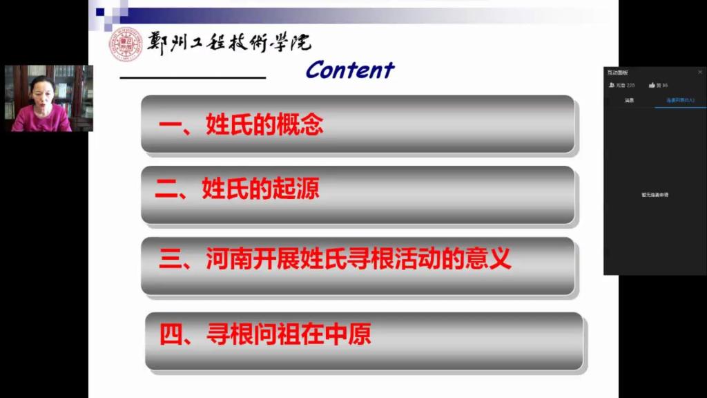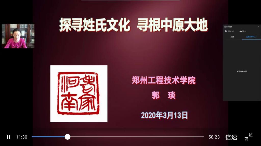 郭琰教授告诉我们,姓氏是我们人类进步的阶段,也是文明的象征,不论你是百家中的哪一个,都有属于自己家族的故事,每个家庭都有属于自己的姓氏。参天之木必有其根,怀山之水必有其源。通过本次的公益课,观众们不仅充分了解了我国源远流长、博大精深的姓氏文化,对中原文化也有了更加深刻的认识。