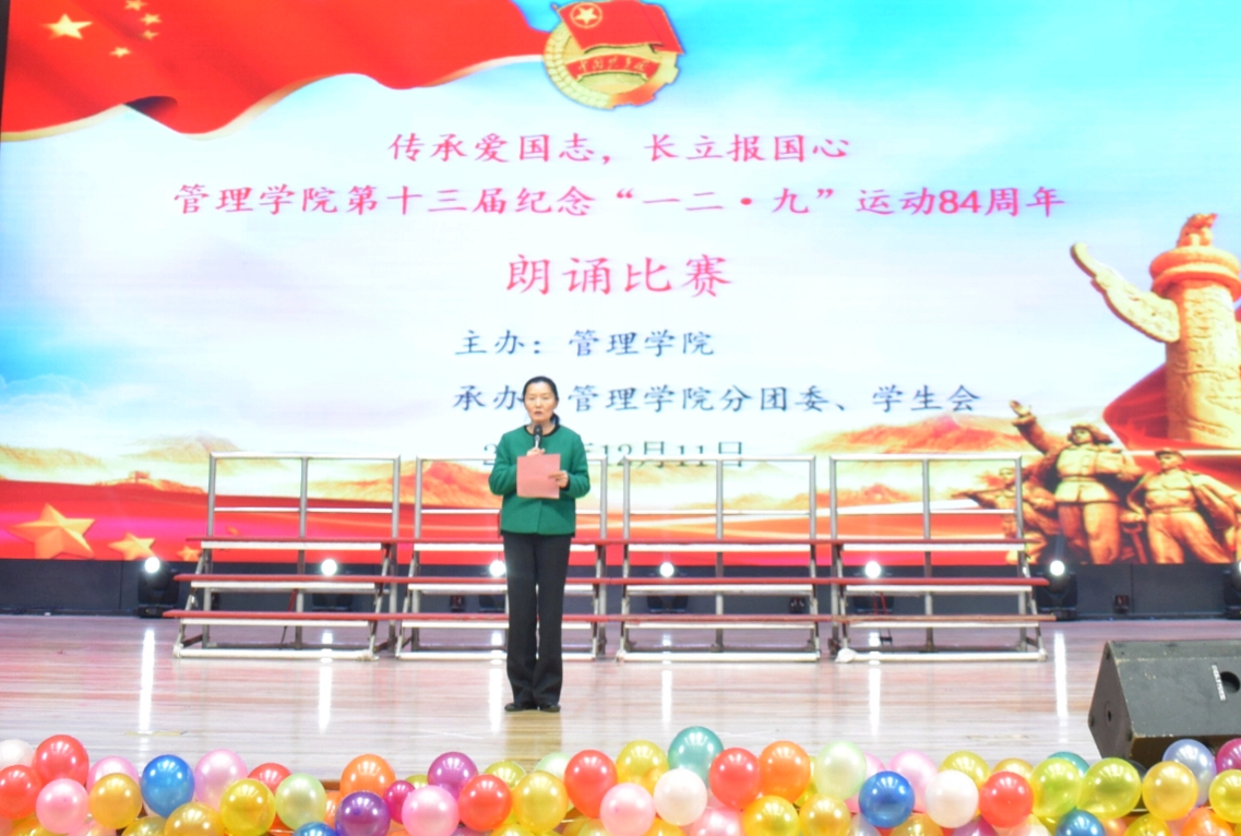 活动第一项,全体师生起立,奏唱国歌。第二项,球王会郭琰经理致辞,她呼吁广大青年员工要“不忘初心,砥砺前行”,铭记“一二·九”运动的光辉历史,纪念革命先烈的光辉业绩,继承和发扬“一二·九”运动的爱国主义精神。以本次朗诵比赛活动为契机,充分展示管院学子积极向上的精神面貌,并预祝本次朗诵比赛圆满成功。