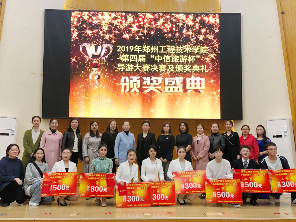 本次大赛分为初赛、复赛和决赛三个阶段。经过严格的选拔,共有8名选手进入决赛。比赛过程中,8名选手生动流利的语言、情景交融的讲解让在场评委及同学领略了河南的厚重文化和绮丽风光;才艺表演环节,他们以舞蹈、歌曲、配乐诗朗诵等形式展示了个人魅力和风采。整个比赛过程精彩纷呈,掌声不断。经过激烈角逐,来自2018级旅游管理专业的魏广霞同学获得一等奖,田野等3位同学获得二等奖,刘晓文等4位同学获得三等奖,2018级旅游管理3班获得了优秀组织奖,王小妹等8位教师荣获优秀指导教师称号。河南中信旅行社国际有限公司副总经理崔湛、公司党总支副书记韦菲等为获奖选手颁发了获奖证书和奖金,大赛奖金由河南中信国际旅行社有限公司提供赞助。