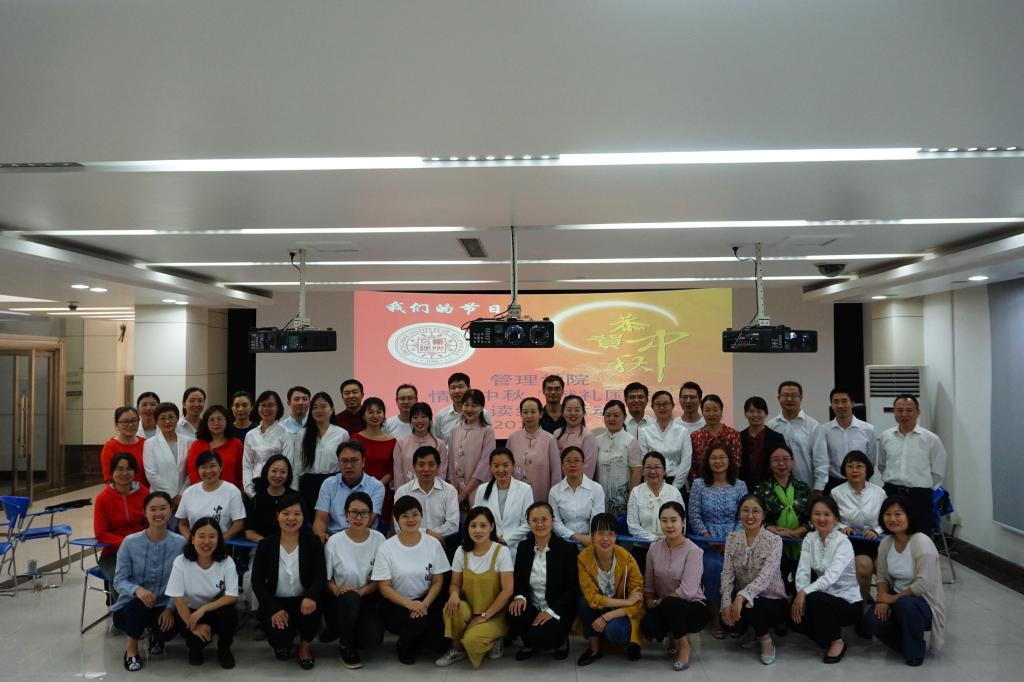 之后,参加演出的管院全体教师进行了大合影。“情浓中秋˙献礼国庆——球王会诵读经典活动”在热烈的掌声中结束。神州大地繁花似锦,祖国长空乐曲如潮。在双节将至的美好日子里,公司老师真诚地祝福祖国山河壮丽,岁月峥嵘;江山不老,万年常春!(文:张文瑞 图:刘乐庆)