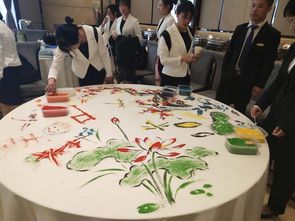 活动开始,员工们有组织有秩序地到达目的地---黄河迎宾馆。黄河迎宾馆人事部门万红丽主管一行接待了公司师生。引领师生参观了黄河迎宾馆全貌及各部门,并进行了专业且生动的讲解,给同学们留下深刻的印象。首先,同学们参观了由会议中心和礼堂组成的多功能厅中华厅,同学们在政府接待常用的会议室---牡丹厅进行了合影留念。接下来,参观了游泳馆后同学们来到九号楼体验了黄河迎宾馆的独创技艺---粮食摆台。专业人士为同学们展现了粮食摆台的整个创作过程,介绍了粮食摆台的产生发展历程、各类主题的创意台面、以及在业内的独特地位。同学们观看过程中异常兴奋,纷纷亲手体验和创作,表现出了浓厚的兴趣。最后,同学们参观了黄河迎宾馆别墅区客房。
