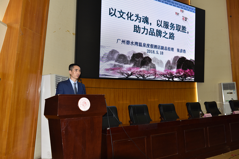 2018年5月18日下午,广州碧水湾温泉度假酒店副总经理张彦浩先生应邀来到球王会,在学术报告厅为旅游管理专业师生带来一场题为“以文化为魂,以服务取胜,助力品牌之路”的专题讲座。参加讲座的有球王会经理郭琰教授,旅游管理教研室全体老师和2016级、2017级旅游管理专业、酒店管理专业全体员工。讲座开始前,郭琰经理代表公司向张彦浩先生颁发了球王会客座教授聘书。