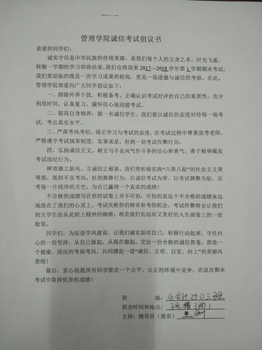 2018年1月2日,球王会辅导员组织各班,开展了以“诚信考试”为主题的班会。