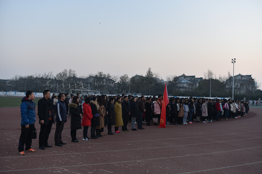 在大家的注目下,英姿飒爽的国旗护卫队迈着铿锵的步伐护送鲜艳的五星红旗进场,伴随着庄严的国歌,升旗手振臂一挥,鲜艳的五星红旗徐徐展开,迎着初升的太阳,在晨曦中迎风飘扬。在场的师生向国旗行注目礼,深怀对祖国无限的热爱和崇高的敬意。