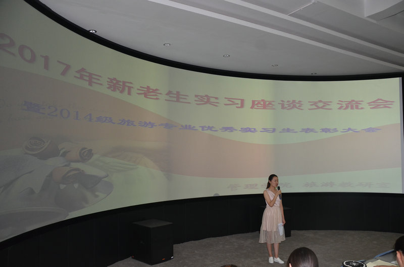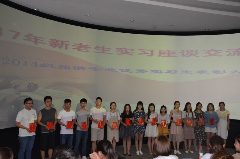接下来,郭琰经理和王斌副经理分别向在实习期间表现优异的优秀实习生代表颁发证书并合影留念。25位来自不同实习单位和岗位的实习生代表分别向2015级的同学们传授他们的实习见闻以及成长的心路历程。通过实习的历练,很多同学对于所学专业结合酒店、旅行社的工作有了更高更全面的认识;对于为人处事、做好本职工作更好的适应社会融入社会有了各自深刻的领悟。同时,同学们的自身修养也在实习中得以体现。