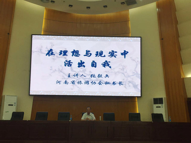 2017年5月26日下午,公司特聘教授、河南省旅游协会副会长、秘书长张毅兵在学术报告厅为公司旅游管理和酒店管理专业同学带来一场主题为“在理想与现实中活出自我”的讲座,旅游管理教研室老师也参与聆听本次讲座。