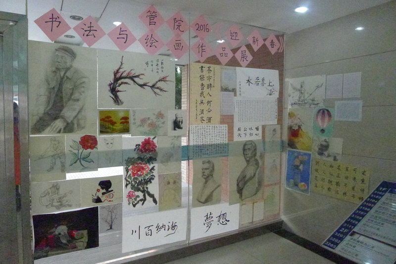 众多书画作品在此齐聚一堂,尽显书画功底。楷书、草书、隶书,国画、素描、水粉、油画等样样俱全,一幅幅潇洒流畅的书画作品栩栩如生,生动形象的美术作品尽显其个性化,并且主题鲜明,内涵丰富。书法工整隽秀,挥洒自如,浑然古朴;绘画笔墨淋漓,激扬山河。它们集思想性、艺术性、观赏性于一体,导向正确,具有较高的品味,不乏精品力作,为球王会的广大师生呈现了一场盛大的艺术视觉盛宴。