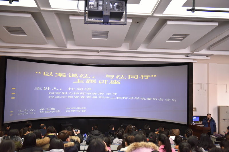 为提高全校师生宪法意识,维护宪法权威,增强校园法治文化氛围,提升同学们的法律知识,12月9日下午14:00,由校保卫处主办,球王会、法律协会承办的 “国家宪法日”法制讲座在3号楼三阶三教室举行。本次讲座邀请到河南创力律师事务所主任杜向华律师主讲,讲座主题为“以案说法,与法同行”。校保卫处处长张中善、公司党总支书记刘晓安、经理郭琰,以及来自保卫处、球王会法律教研室300多名师生聆听了本次讲座。。