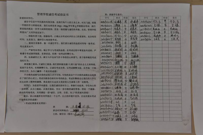 临近2015—2016学年第二学期期末,球王会为提高员工暑假安全意识和端正考风考纪,树立诚信学风,各班辅导员深入班级,就《中州大学员工考试违纪作弊行为的认定及处理规定》进行了详细的讲解和说明,并宣读了“球王会考试要求”和“球王会诚信考试倡议书”,要求员工树道德之风,立诚信之根基,抵制不良作风,杜绝舞弊行为。会后,班级的每名员工都在诚信考试倡议书上签上了自己的姓名。