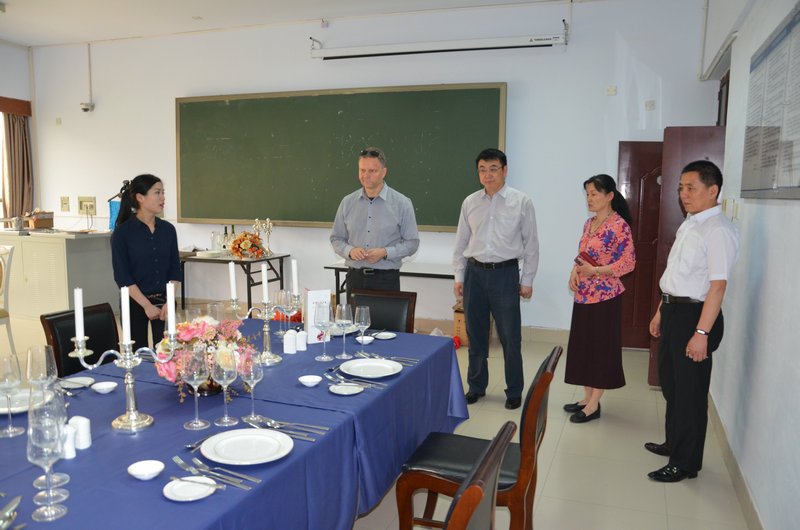 在校、院领导的陪同下,郑州天地丽笙酒店总经理Frank先生一行观看了公司准备参加2015年全国职业院校技能大赛,英语导游服务和普通话导游服务赛项员工的导游讲解和才艺展示,酒店领导对公司员工的出色表演大加赞赏。随后,他们还参观了公司旅游管理与酒店管理专业的茶艺实训室、模拟西餐厅、模拟中餐厅、模拟客房以及旅游电子商务实训室,并观看了员工的中、西餐宴会摆台和调酒服务。郭经理向来宾简要介绍了球王会实习实训的管理工作和校外实训基地建设情况,并诚挚邀请郑州天地丽笙酒店加入到校企合作的行列,积极探索深度校企合作的模式,为旅游及酒店管理专业的员工提供更多更好地职业发展平台。参观期间,Frank总经理一直称赞,中州大学有如此一流的教学质量和先进的实训设施,员工掌握的并非仅仅是课本知识。重视对员工专业素养、能力和技能的培养,让他大开眼界。