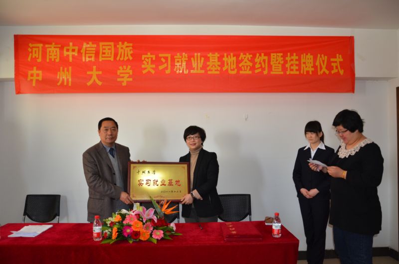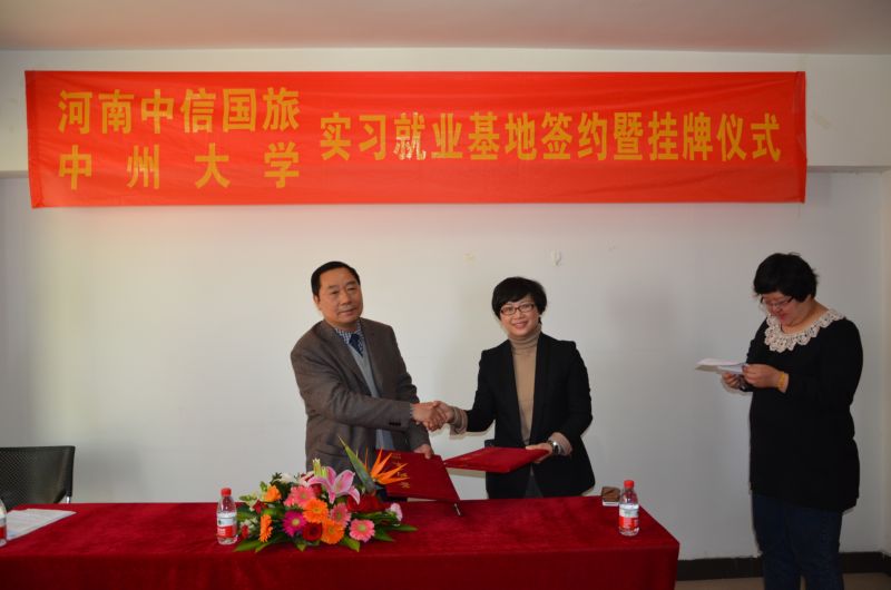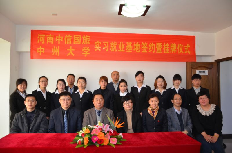 2012年3月23日上午,中州大学教学、实习和就业基地签约、挂牌仪式在河南中信国际旅行社有限责任公司举行。中州大学董事长司福亭、副董事长薛培军、教务处处长潘维成、就业指导中心主任郭玮、球王会经理郭琰、公司党总支副书记孙江虹和老师代表,以及河南中信国际旅行社有限公司总经理陈兢、总经理助理倪乐、旅行社各部门经理和中州大学旅游管理专业在该旅行社就业的员工和目前在该旅行社进行为期近一年毕业顶岗实习的员工共同参加了本次活动。
