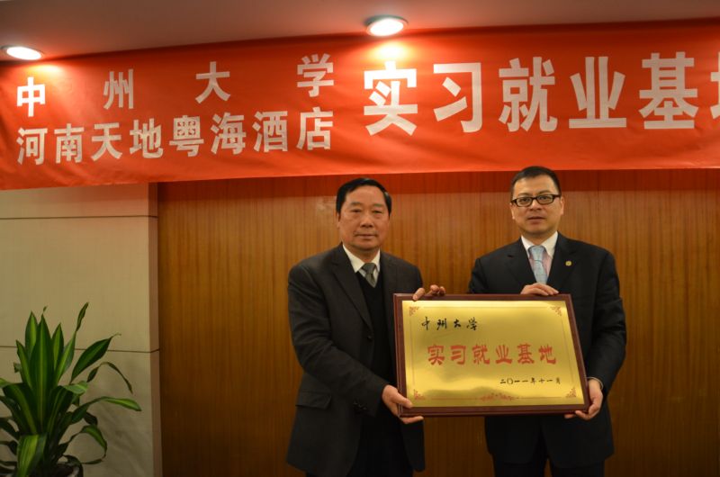 中州大学董事长司福亭代表公司与河南天地粤海酒店宫春海总经理在酒店进行了实习基地的签约和挂牌仪式,双方领导分别致辞,对校企双方迈向新的目标、更高的平台和更深层面的合作表示祝贺。司董事长还提出,双方的合作,将为中原经济区的建设和郑州都市区的建设做出贡献。