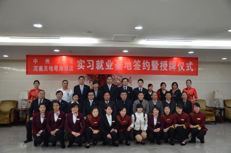 河南天地粤海酒店出席本次签约挂牌仪式的有酒店总经理宫春海、总经理助理刘华凯以及酒店各部门的总监和中州大学旅游管理专业在该酒店就业的员工和目前在该酒店进行为期近一年毕业顶岗实习的员工。