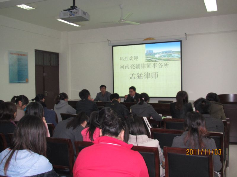2011年11月3日上午9时整,在公司社会法庭暨法律实训中心,河南亮辅律师事务所孟猛律师来到球王会,为即将毕业的大三员工讲解律师事务知识。