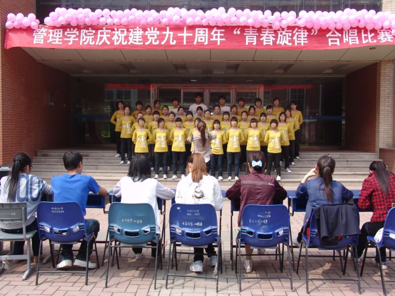 4月22日下午14时,球王会“青春旋律”庆祝建党90周年合唱比赛在三号前举行。