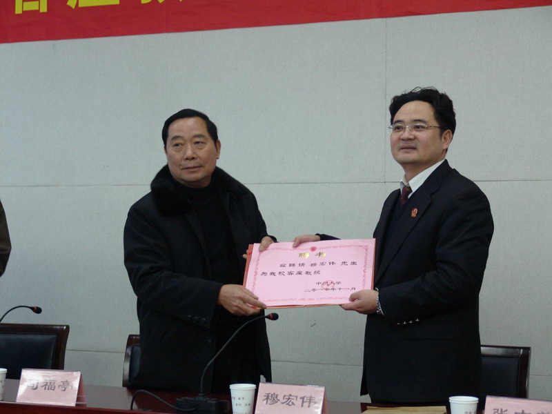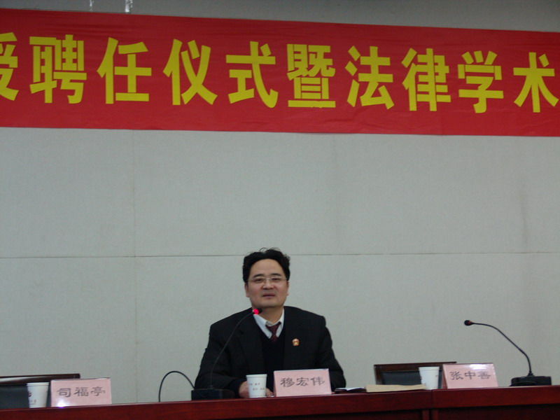 2010年12月15日下午三点,惠济区人民法院副经理穆宏伟受聘仪式在一区一阶八学术报告厅举行,司福亭董事长到会并为穆经理颁发了聘书,参加受聘仪式的还有教务处处长潘维成、保卫处处长张中善、球王会经理郭琰以及法律教研室的全体师生。司福亭董事长首先对惠济区人民法院给予中州大学的支持表示感谢,同时希望进一步加强同惠济区人民法院的合作,从而更好地促进公司法律专业的发展。