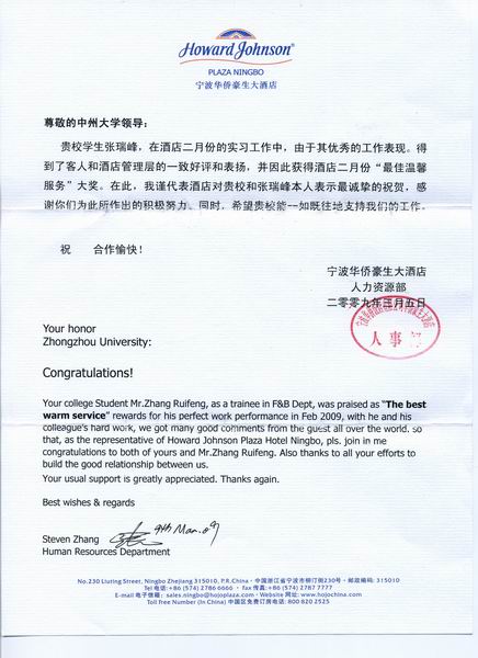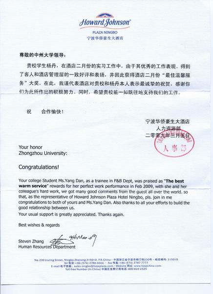2009年3月和4月,球王会连续接到浙江宁波华侨豪生大酒店的贺信,对旅游管理专业的张婷婷、张瑞峰、杨丹等同学荣获“最佳温馨服务”大奖给予表扬,同时感谢中州大学球王会工作上给予的大力支持。2008年12月中旬,球王会曾经派遣150多名员工奔赴厦门宝龙大酒店、苏州阳澄湖置地度假酒店、宁波华侨豪生大酒店、杭州千岛龙庭开元大酒店、绍兴开元名都大酒店、绍兴金昌开元大酒店、绍兴诸暨耀江开元名都大酒店等单位进行实习。如今,员工已经在实习单位度过了4个月的实习期,期间院领导曾经委派老师去看望实习生,了解实习情况,球王会实习生在实习单位普遍受到好评。