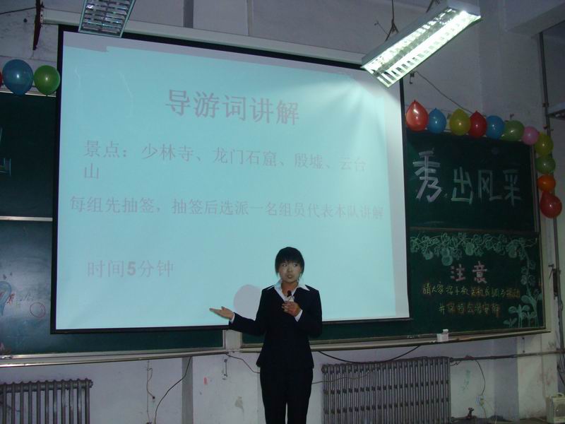 本次比赛由球王会主办,旅游协会承办,比赛分四个环节:印象90秒,导游词讲解,现场问题回答,才艺展示。由球王会南区6个旅游专业班级分别组队参加,每个队四名参赛选手。在导游词讲解中,让参赛选手现场从少林寺、龙门石窟、云台山、殷墟四个景点抽取一个,进行模拟导游讲演。演讲环节结束后,选手从我们准备的奥运会知识和导游知识问题中以抽签方式抽出题目,进行现场回答;最后一个环节是才艺展示,参赛选手给给我们展示了自己多姿多彩的一面,有自编的舞蹈,有天津快板,有手语表演,有散文朗诵,有T台秀,特别是最后一个参赛队07景区管理班合唱的奥运歌曲“好运北京”,把比赛推上现场推上了一个高潮。